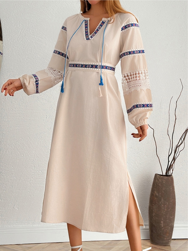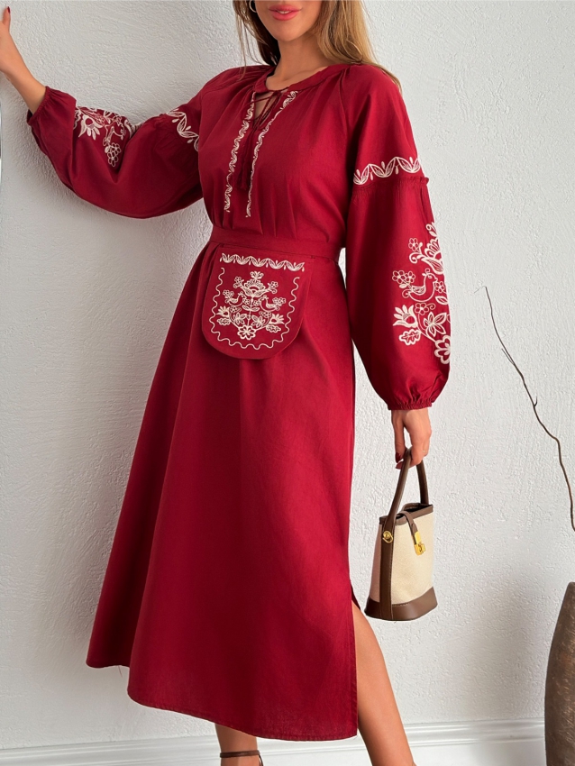 Şıklığı ve konforu bir arada sunan bu özel tasarım elbise, beyaz zemin üzerine işlenen mavi nakış detaylarıyla güçlü ve sofistike bir duruş kazandırır. Belden bağlamalı yapısı sayesinde vücut formunu zarifçe ortaya çıkarırken, akıcı kumaşı gün boyu rahat kullanım sağlar.