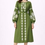 Yeşil Keten Nakış İşlemeli Bohem Elbise – Belden Bağlamalı Otantik Elbise
