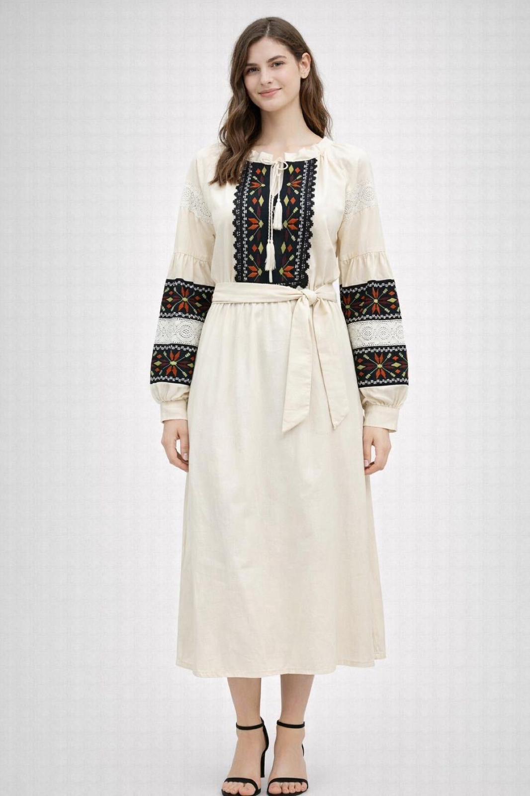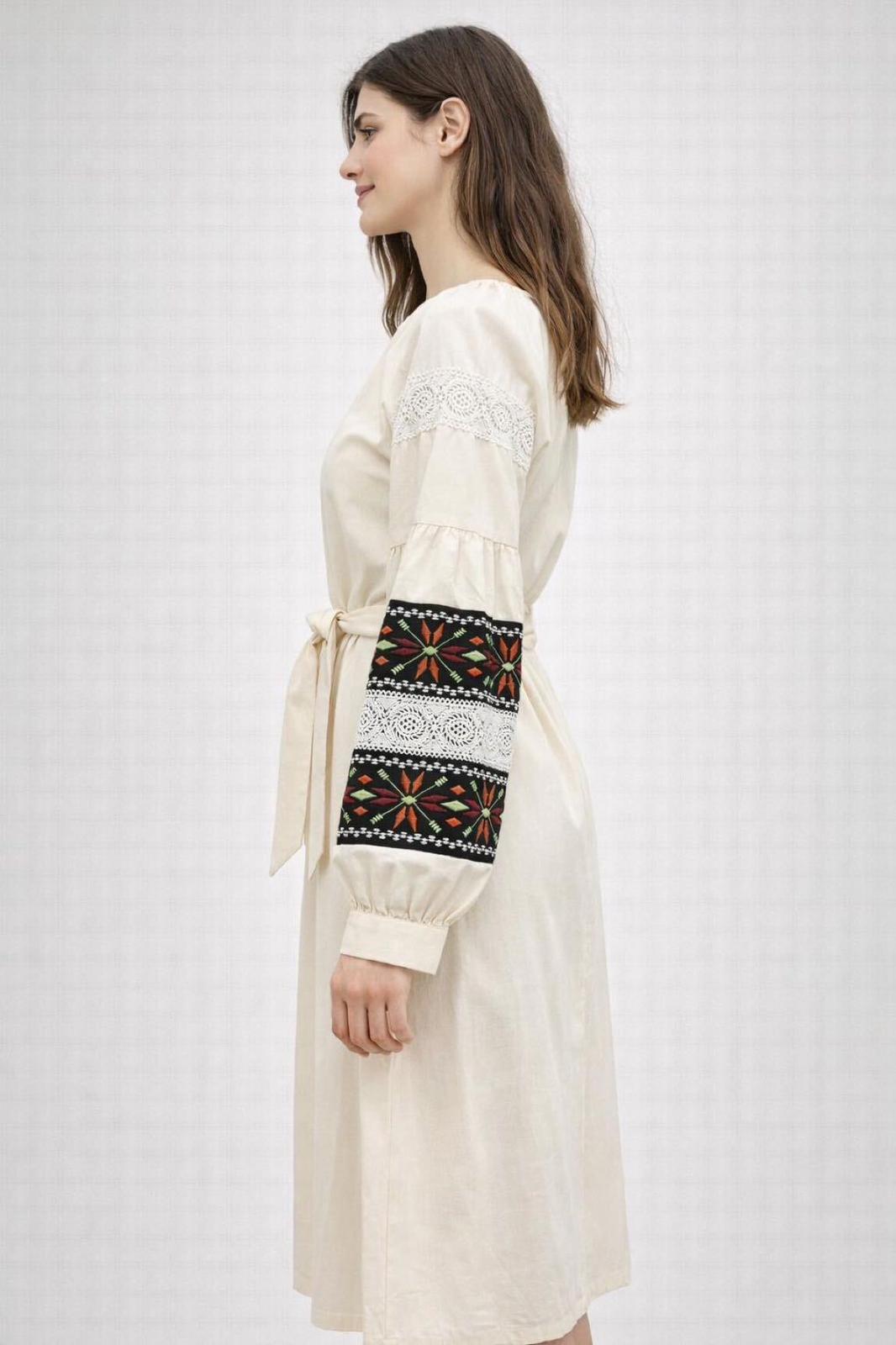 Bej Keten Etnik Nakışlı Midi Elbise - Dantel Detaylı Bohem Tasarım - Görsel 2
