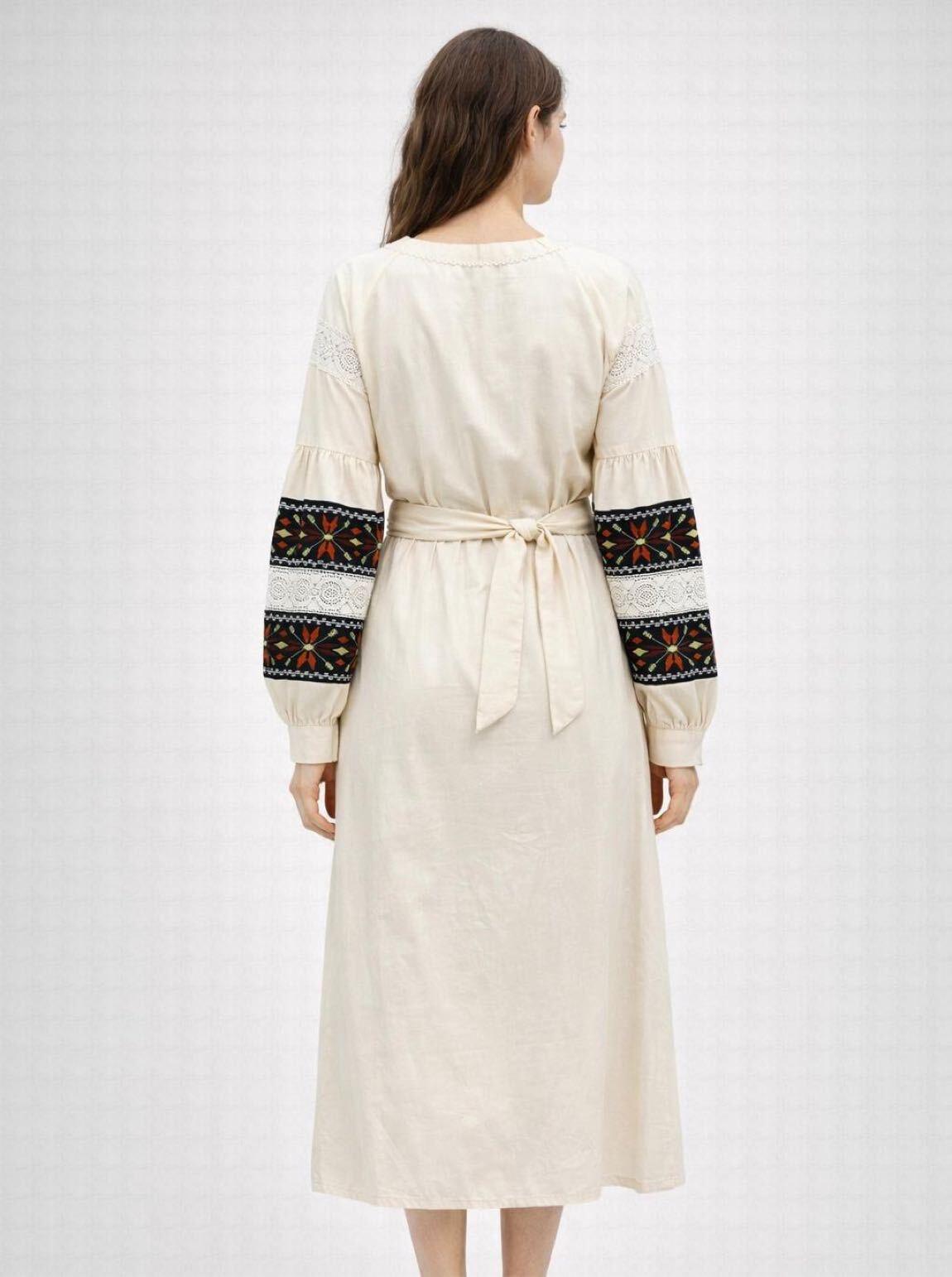 Bej Keten Etnik Nakışlı Midi Elbise - Dantel Detaylı Bohem Tasarım - Görsel 4