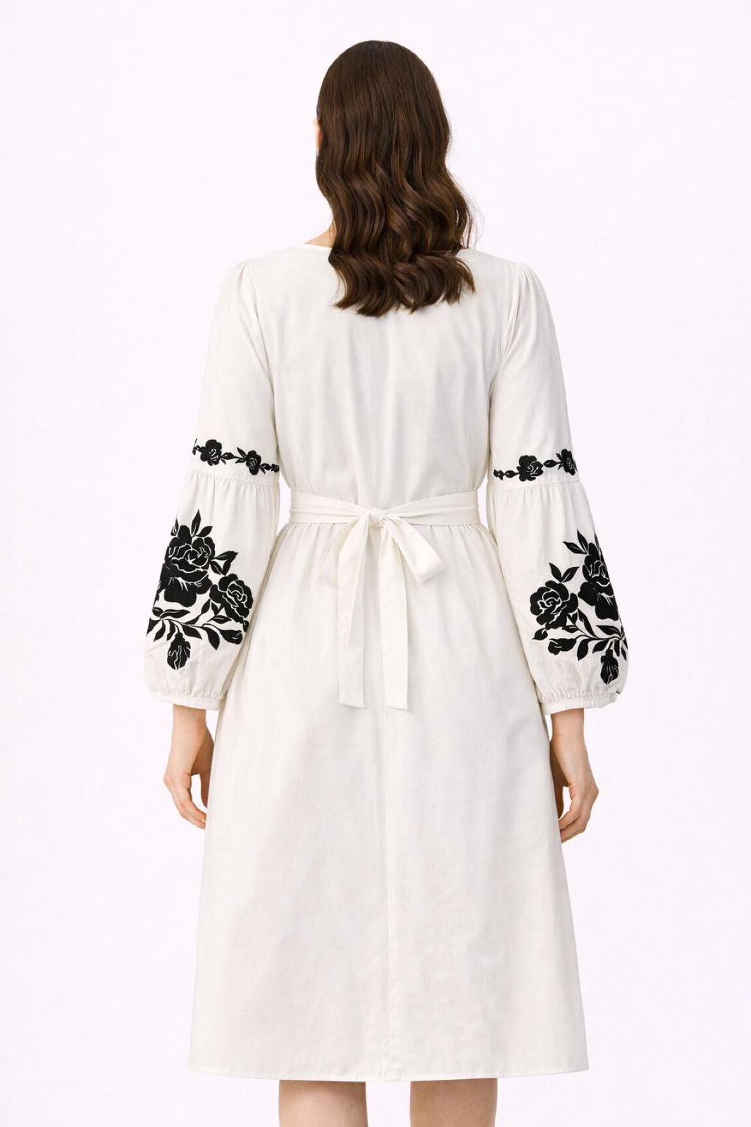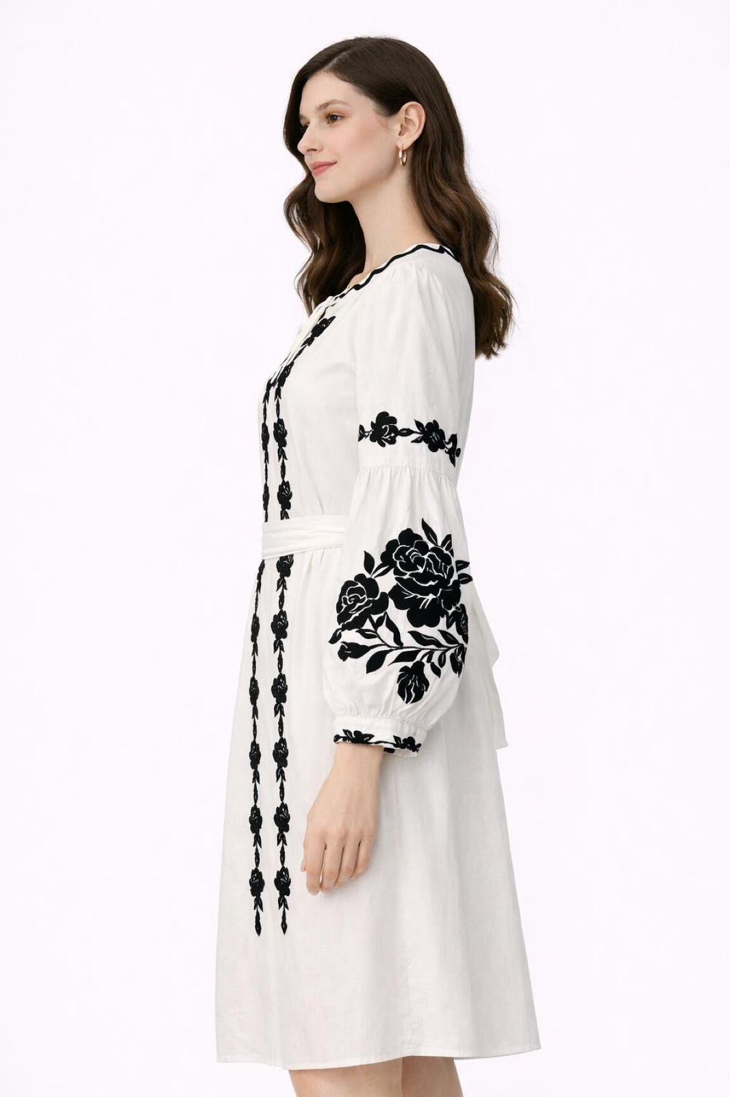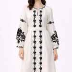 Ekru Keten Siyah Gül Nakışlı Elbise – Kontrast İşlemeli Bohem Midi Elbise