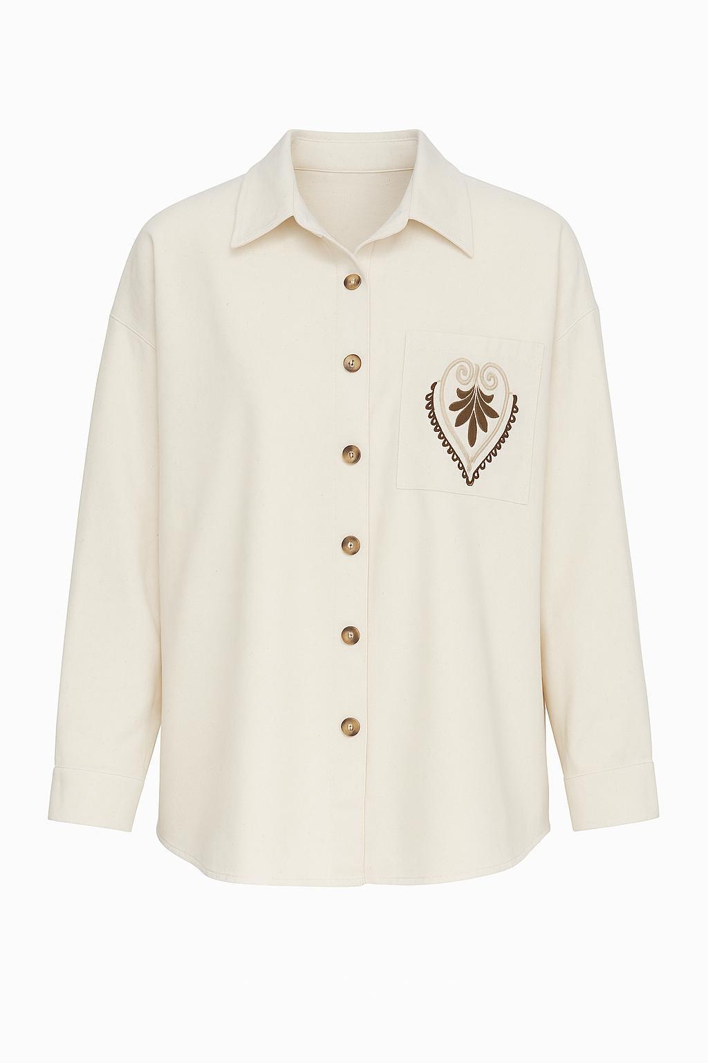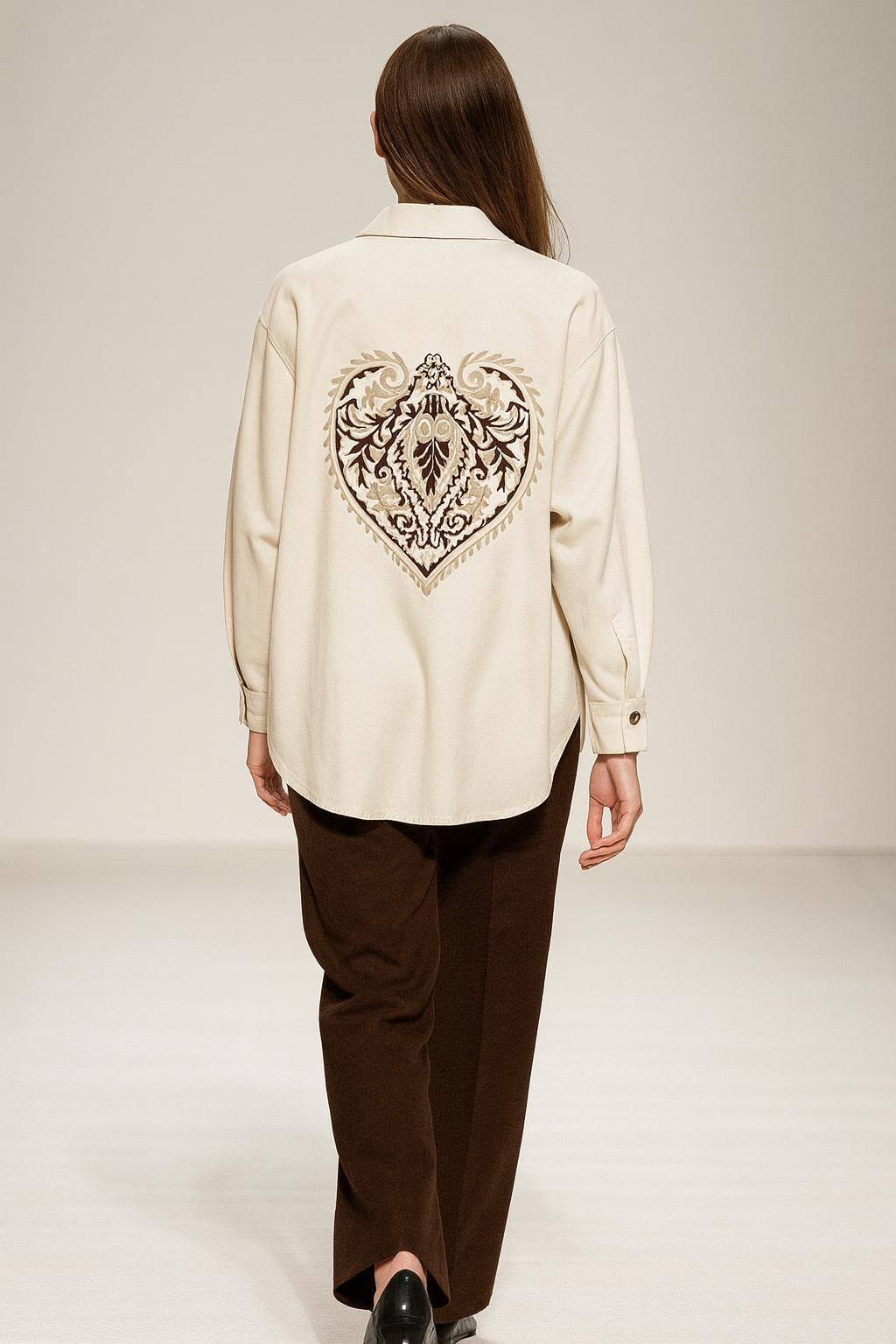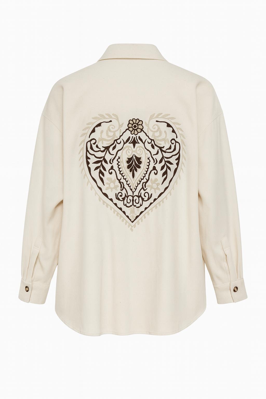 Etnik Kalp Nakışlı Ekru Gabardin Tasarım Gömlek
