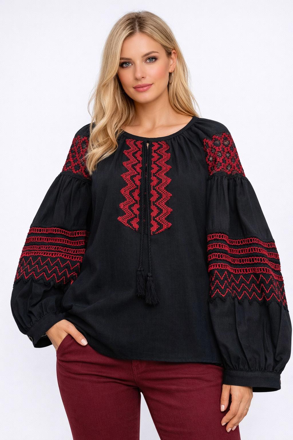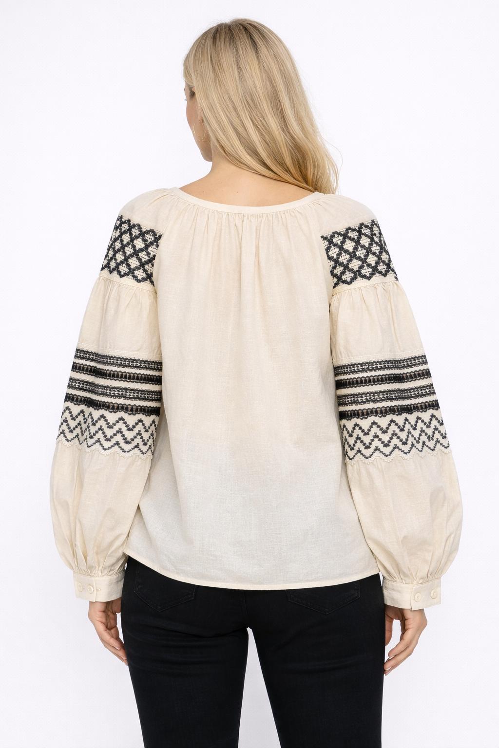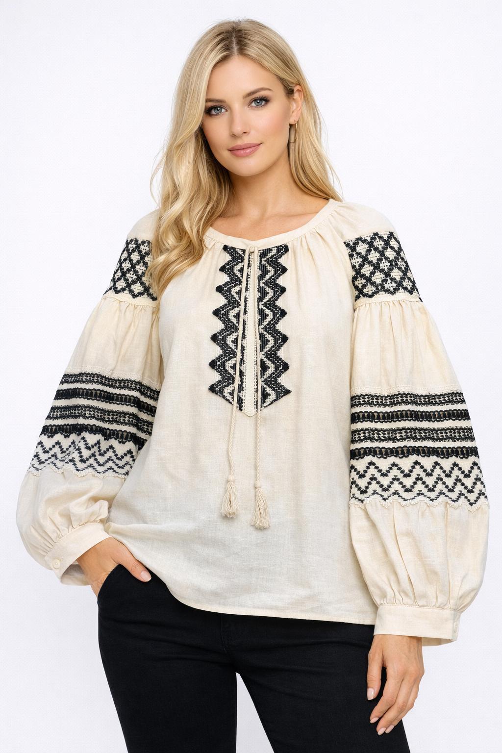 Mart 11, 2026Mavi Nakış İşlemeli Bohem Keten Bluz – Balon Kol Tasarımlı