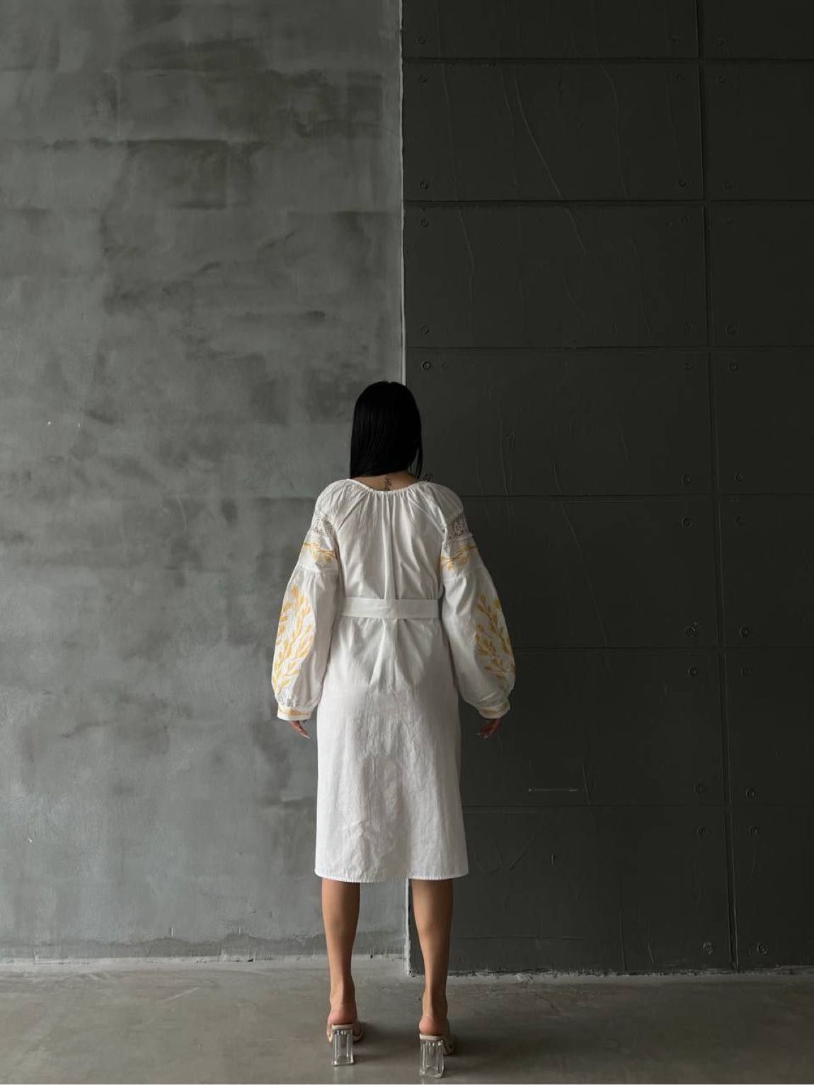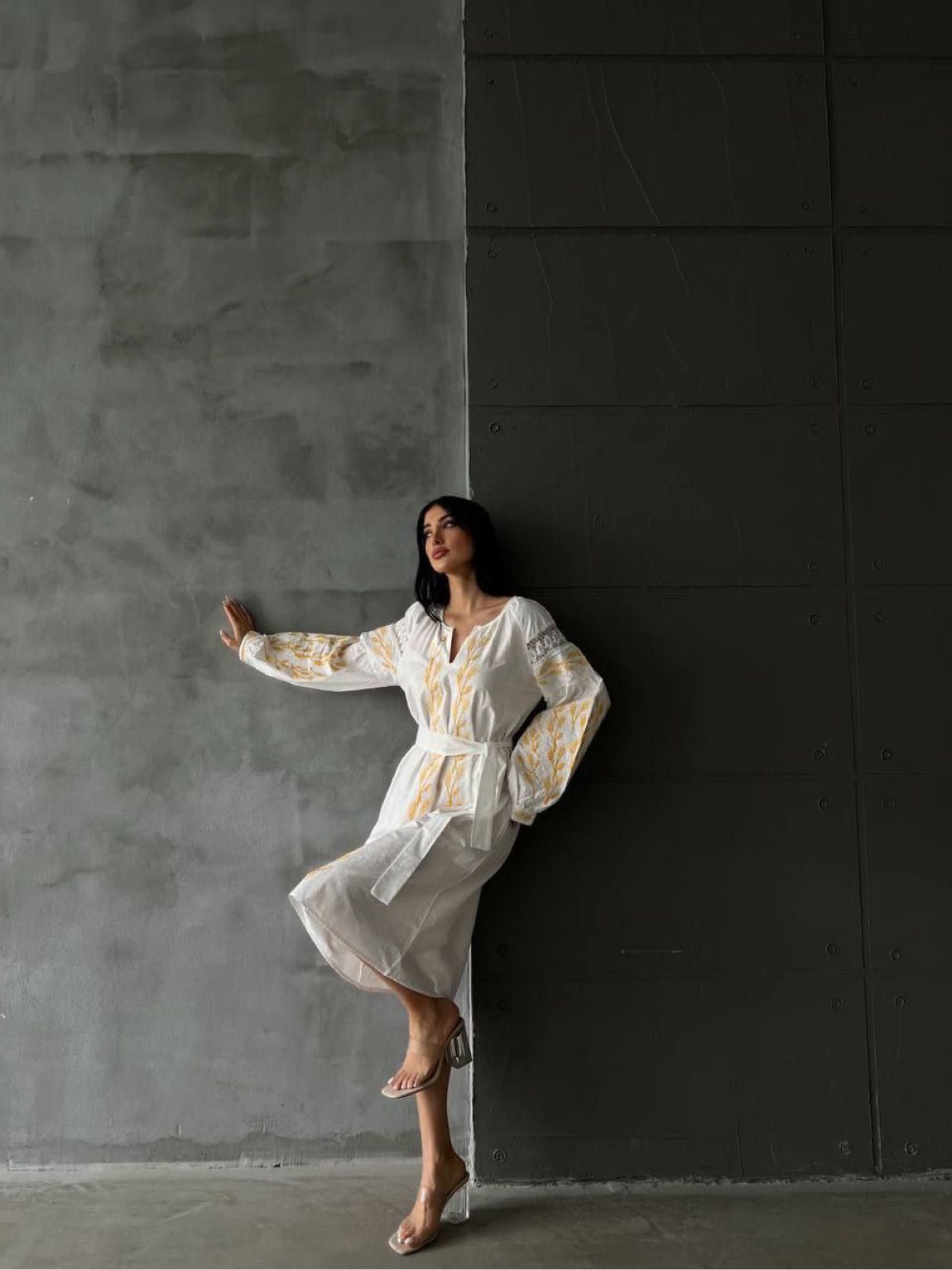 Zarafeti ve doğallığı bir araya getiren bu özel tasarım elbise, üzerindeki canlı sarı başak nakışlarıyla baharın ve bereketin enerjisini stilinize taşıyor. Beyazın saf dokusu üzerine işlenen ince detaylar, omuzlardaki zarif dantel geçişleri ve bohem ruhu yansıtan püsküllü yaka detayıyla her bakışta hayranlık uyandırıyor. Belindeki kendi kumaşından kuşağı sayesinde silüetinizi dilediğiniz gibi vurgulayabilir, balon kol yapısıyla konforlu bir şıklık elde edebilirsiniz.