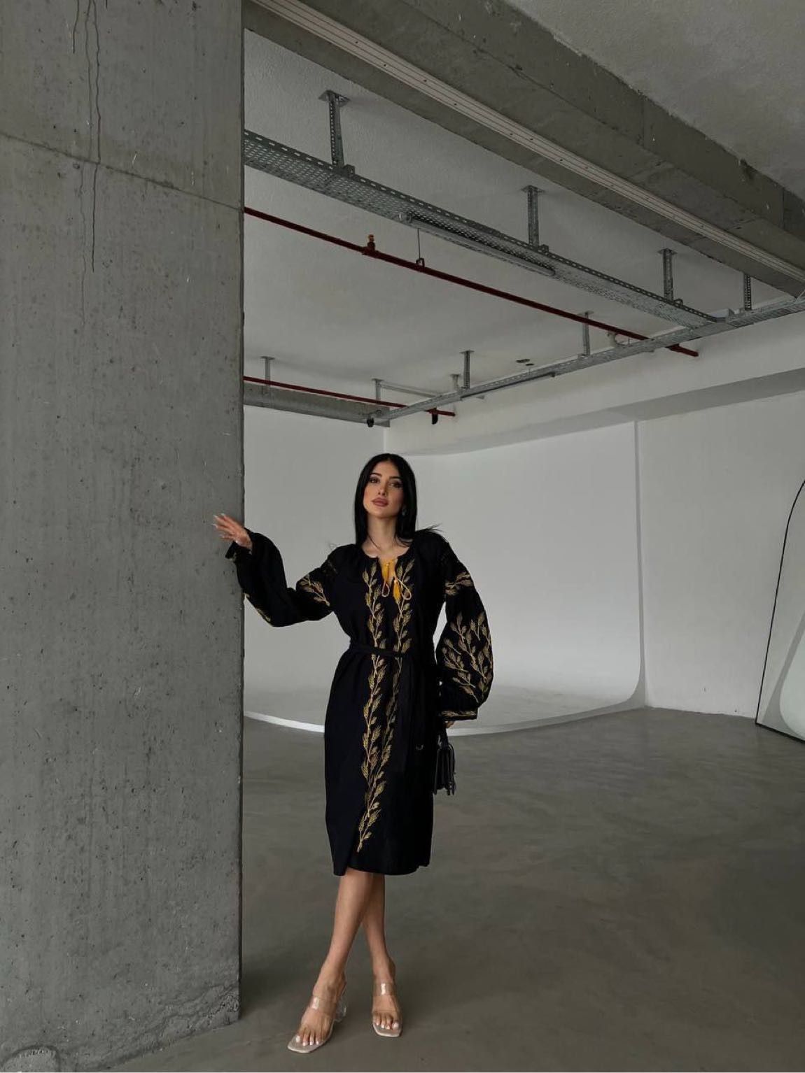 Otantik Nakış İşlemeli Balon Kol Kuşaklı Midi Boy Tasarım Elbise - Görsel 2