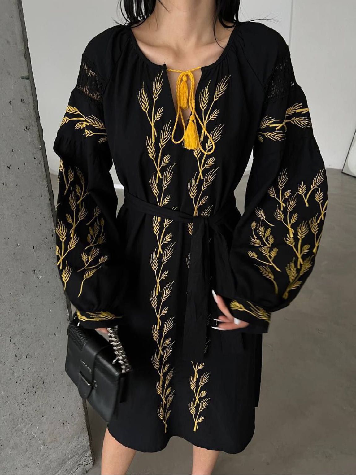 Modern Vyshyvanka Tarzı Keten Maksi Elbise – Belden Bağlamalı, Balon Kollu Bohem Şıklık